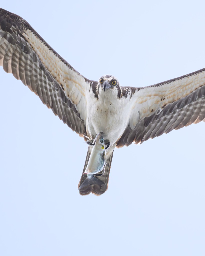 Last spring and summer, we had daily Osprey fly-overs for the park, frequently with an Osprey carrying a fish. It never became boring seeing an Osprey carrying a fish, but it made me want to catch a photo of them fishing – or, more specifically, catching a fish.