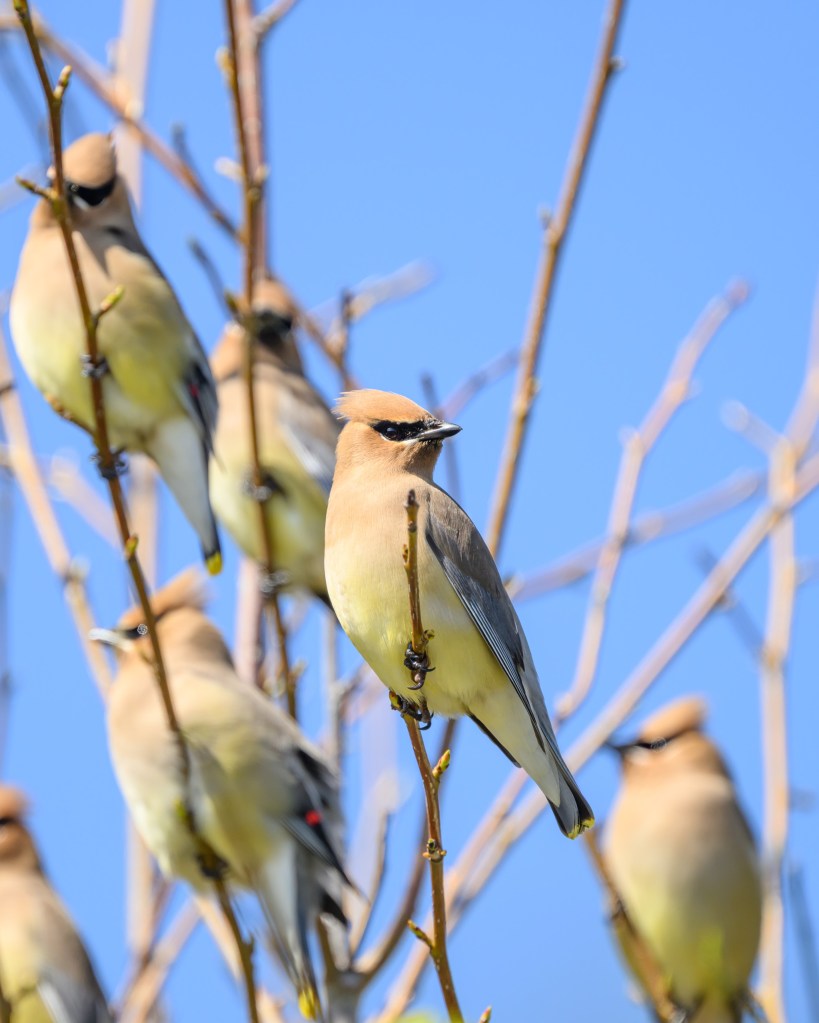 The under-rated Cedar Waxwings frequently come in-and-out in flocks of 20 or more birds.