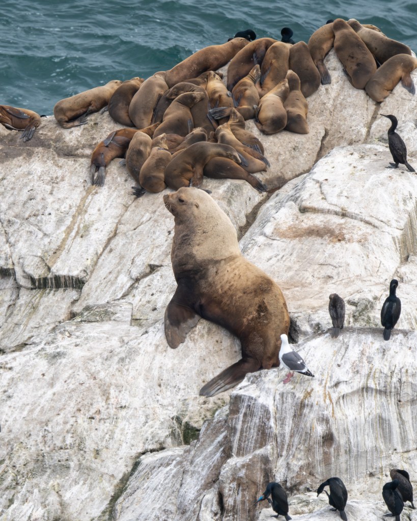 We reached the lighthouse where our group started. Our leader Chris quickly took us to an overlook to see an uncommon visitor – a Steller Sea Lion. We saw at least three individuals, and these were BIG BOYS.