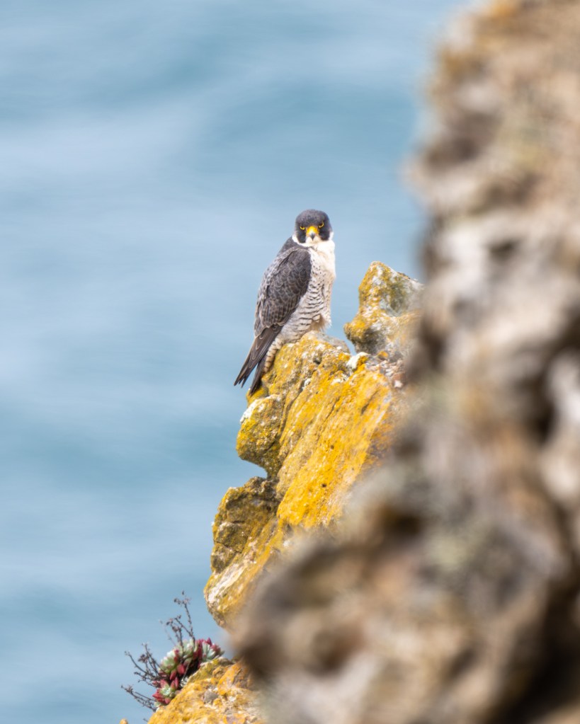 Around the corner from the Murres, we saw a nesting Peregrine Falcon. My supposition is that the falcon chose his location next to the supermarket of Murres.